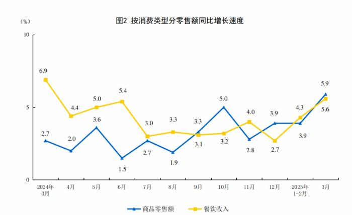 按消費(fèi)類型分,3月份,商品零售額36705億元,同比增長5.9%;餐飲收入4235億元,增長5.6%。1—3月份,商品零售額110644億元,增長4.6%;餐飲收入14027億元,增長4.7%。