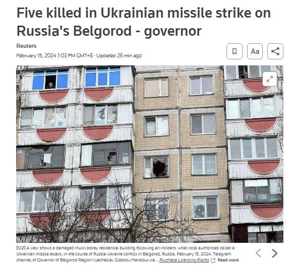 中新網2月15日電 據路透社報道,俄羅斯官員稱,當地時間15日,烏克蘭導彈襲擊俄羅斯別爾哥羅德州,造成5人死亡,其中包括一名兒童。