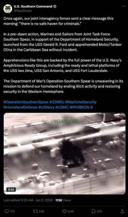 2026年1月9日,美國南方司令部確認(rèn),美軍與美國國土安全部在一次聯(lián)合行動中,在加勒比??刂撇⒖垩骸皧W利娜”號油輪。