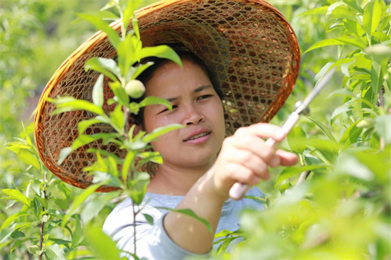 “今年是一個豐收年,我們正在給果園松土和縮果。等下個月底成熟了,歡迎大家來吃甜蜜蜜的黃桃。”東安縣大廟口樂福村,成片的黃桃進入掛果期,唐云云站在“云端”,提前向網(wǎng)友發(fā)出豐收的邀請。