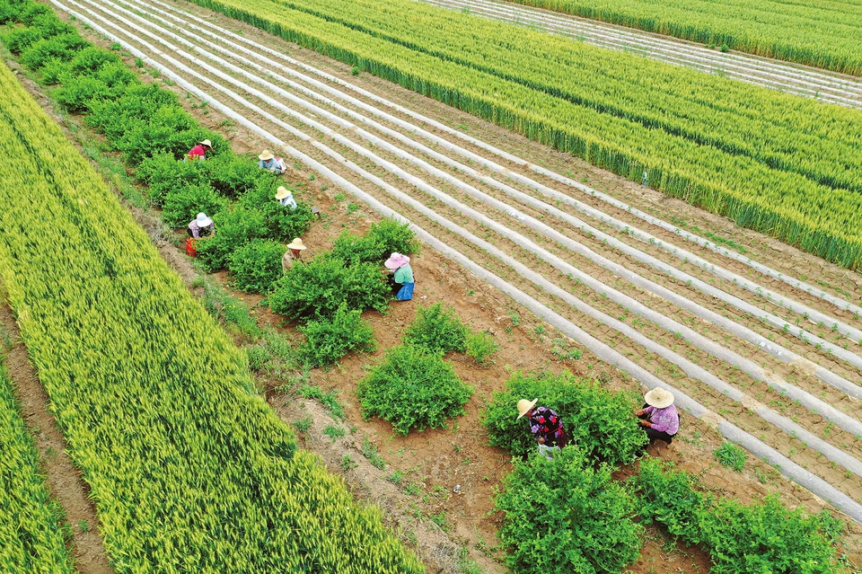 5月27日,新絳縣澤掌鎮(zhèn)吳嶺莊村,村民在采摘金銀花。連日來,當(dāng)?shù)剞r(nóng)民抓緊晴好天氣,加強(qiáng)對(duì)頭茬早熟玉米、辣椒、大蔥、中藥等進(jìn)行田間管理。(高新生攝)