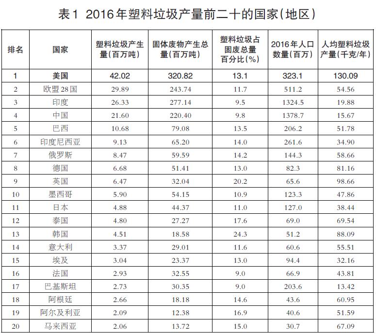 對比兩次研究結(jié)果發(fā)現(xiàn),從2010年到2016年,全球塑料生產(chǎn)量從3.34億噸增加到了4.22億噸,增加了26%,全球塑料垃圾占固體廢物的比例從10%上漲到了12%,2016年全球塑料垃圾達(dá)到了2.42億噸。從2016年每個(gè)國家產(chǎn)生的垃圾量(表1)看出,美國產(chǎn)生的固體廢物總量、塑料垃圾總量以及人均塑料垃圾產(chǎn)量(超過100千克)均為世界最多。相比之下,中國的人均塑料垃圾生產(chǎn)量僅為美國的20%。歐盟28國作為一個(gè)整體,雖然總?cè)丝谥挥杏《然蛑袊丝诘?0%,產(chǎn)生的塑料垃圾總量比印度或中國都要多。但即便在歐盟,人均塑料垃圾產(chǎn)量也不到美國的一半。