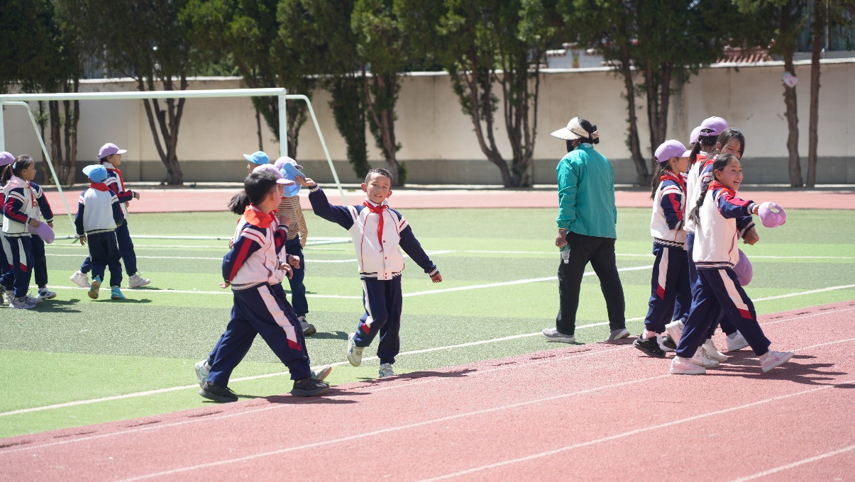 “利利老師,我們來玩老鷹抓小雞?!辈賵?chǎng)上,剛剛整隊(duì)完,正自由活動(dòng)的學(xué)生喊學(xué)校的湖南援藏教師、體育學(xué)科教研組組長戴勝利。