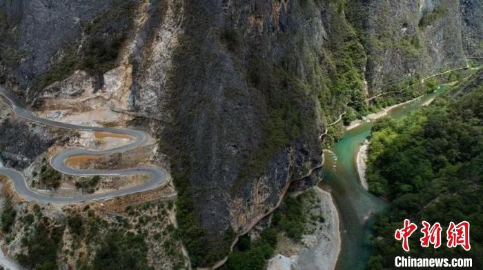 圖為在迪慶高山峽谷間修筑的公路?!≈泄蚕愀窭锢形麄鞑抗﹫D
