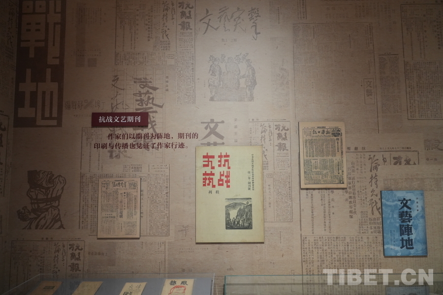 圖為中國(guó)現(xiàn)代文學(xué)館內(nèi),“山河跡憶——手稿里的抗戰(zhàn)中國(guó)”展覽中,《抗戰(zhàn)文藝》期刊的介紹。安娥是《抗戰(zhàn)文藝》編委會(huì)的成員之一  攝影:郭睿佳