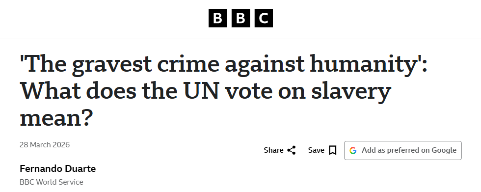 英國(guó)廣播公司網(wǎng)站3月28日刊登題為《“最嚴(yán)重的反人類(lèi)罪”:聯(lián)合國(guó)關(guān)于奴隸制的表決意味著什么?》的報(bào)道。報(bào)道稱(chēng),聯(lián)合國(guó)大會(huì)近日以壓倒性多數(shù)通過(guò)了一項(xiàng)決議,認(rèn)定跨大西洋奴隸貿(mào)易為“最嚴(yán)重的反人類(lèi)罪”。