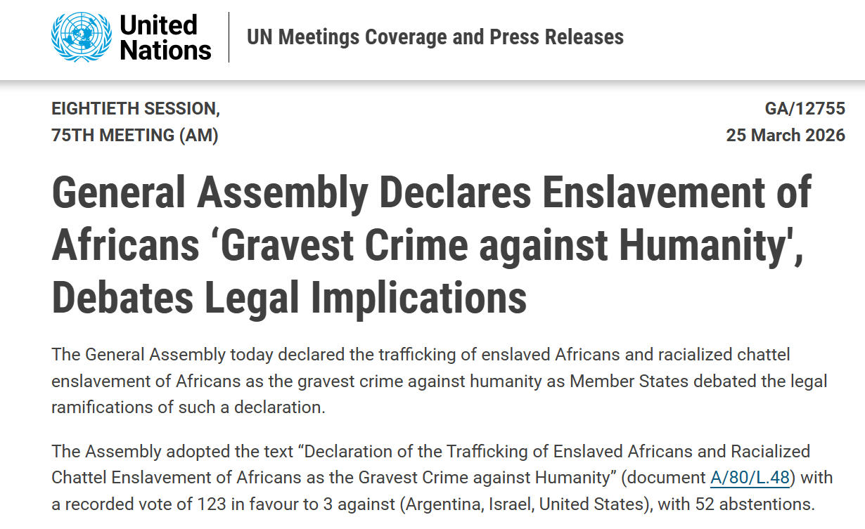 近日,第80屆聯(lián)合國大會以壓倒性贊成票通過決議,將“販賣被奴役非洲人和基于種族對非洲人進行物化奴役行為”認定為最嚴重的反人類罪行,為這段15到19世紀長達四百年的深重歷史創(chuàng)傷定性。美國傲慢地投下反對票,聲稱相關(guān)行徑在當時所謂國際法框架下“不算違法”,拒絕承認存在法定賠償責任。