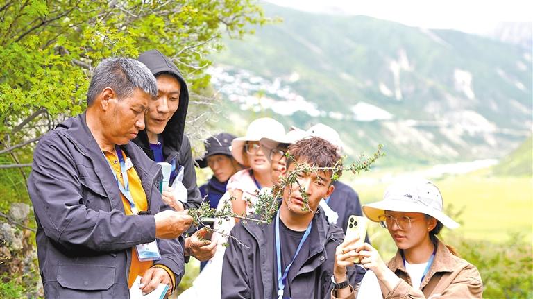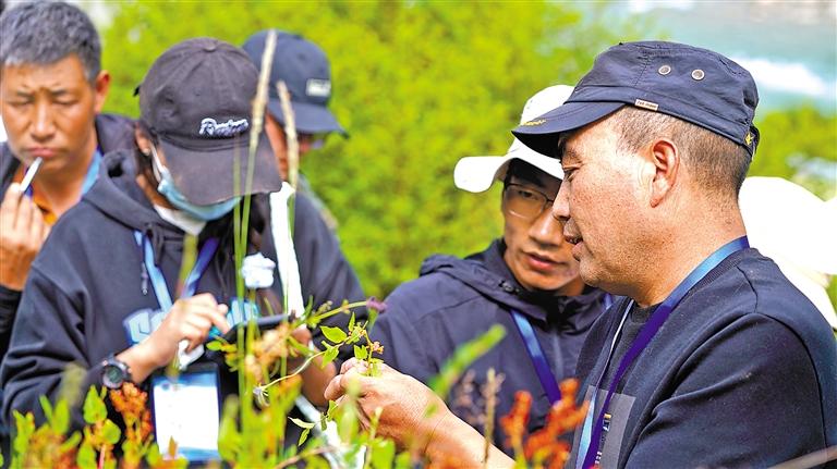 圖為藏醫(yī)專家(右一)現(xiàn)場講解野生藥材辨認(rèn)方法。