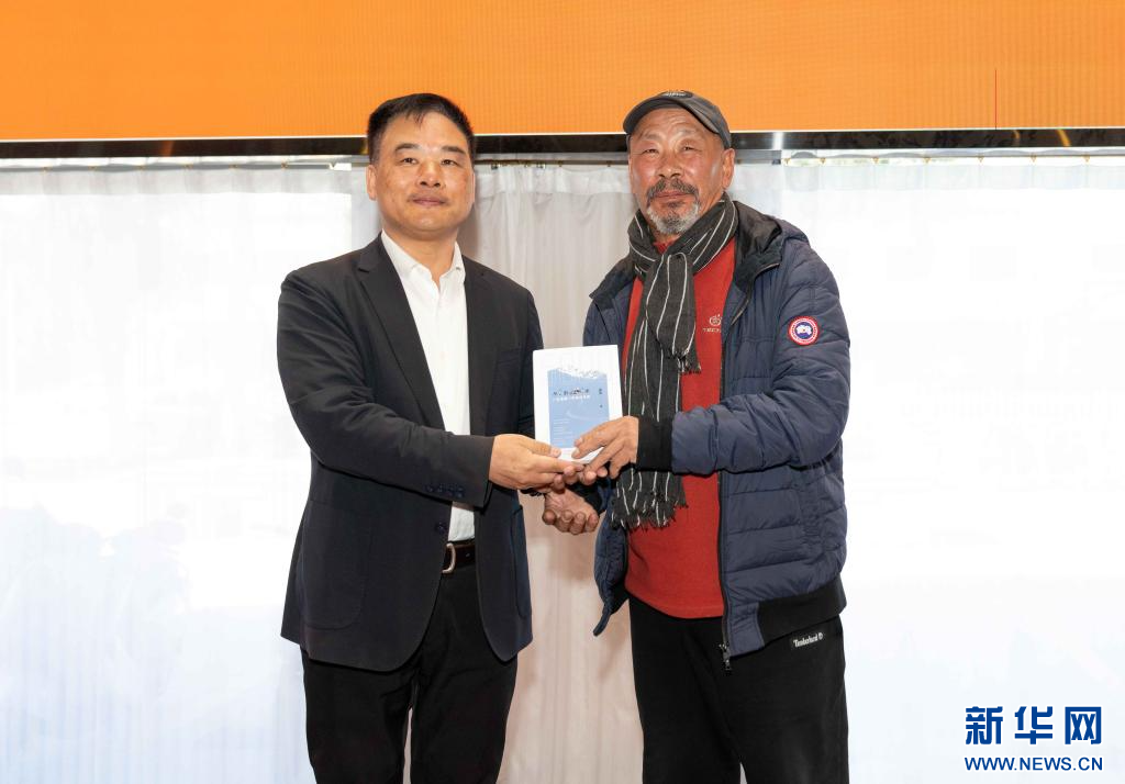 作者余風(fēng)(左)向蒞臨的嘉賓贈(zèng)書(shū)留念(11月9日)。新華社記者 旦增尼瑪曲珠 攝