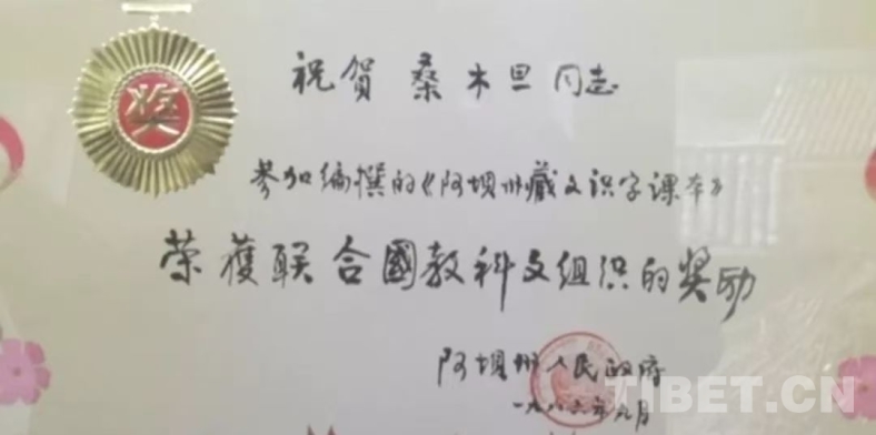 作為一個智慧過人的學者,1986年9月,為了藏語文教育的進一步普及,毛爾蓋·桑木旦不僅為掃盲四處奔跑,講授藏語文基礎課,而且主編了《藏文掃盲課本》,此書由國家教委推薦參加了亞太地區(qū)掃盲教材比賽,并榮獲聯(lián)合國教科文組織的獎勵。為此阿壩州人民政府頒發(fā)證書,祝賀桑木旦同志榮獲聯(lián)合國教科文組織的獎勵。我相信中國藏學界獲得此獎者,毛爾蓋·桑木旦先生為第一人。