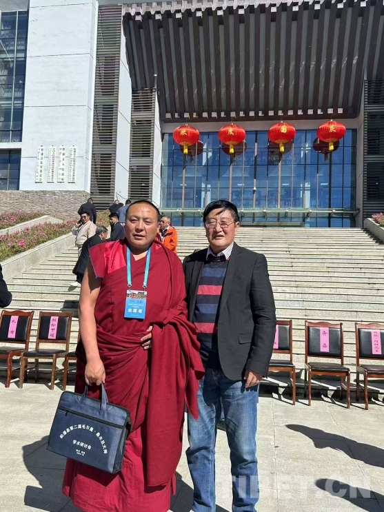 圖為作者格勒(右)在松潘縣第二屆毛爾蓋·桑木旦學術研討會現(xiàn)場(圖片由作者提供)