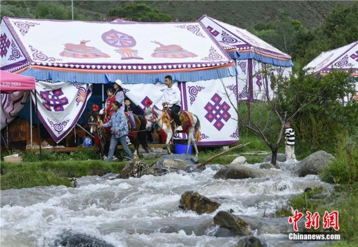 2024年7月28日,市民在位于西藏自治區(qū)拉薩市堆龍德慶區(qū)的達(dá)東村“過林卡”。過林卡是藏族人最普遍的休閑娛樂方式,類似于郊游和野餐。中新社記者 貢嘎來松 攝