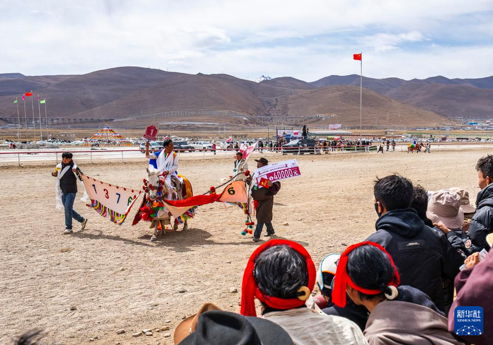4月27日,來(lái)自拉薩曲水縣的馬匹在純藏馬跑馬賽中獲得第一名,馬主接受觀眾歡呼。新華社記者 丁增尼達(dá) 攝
