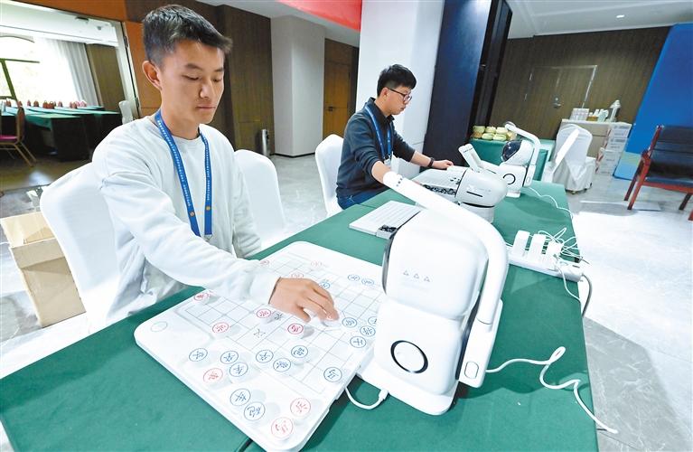 圖為“拉薩職工互助保障杯”智力運(yùn)動會現(xiàn)場,象棋選手在賽前與智能機(jī)器人對弈。記者 唐斌 攝