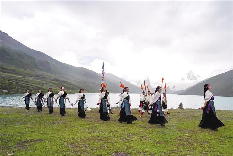 西藏那曲市比如縣藝術(shù)團(tuán)的演員在薩普雪山景區(qū)為游客表演(7月19日攝)。新華社記者 晉美多吉 攝