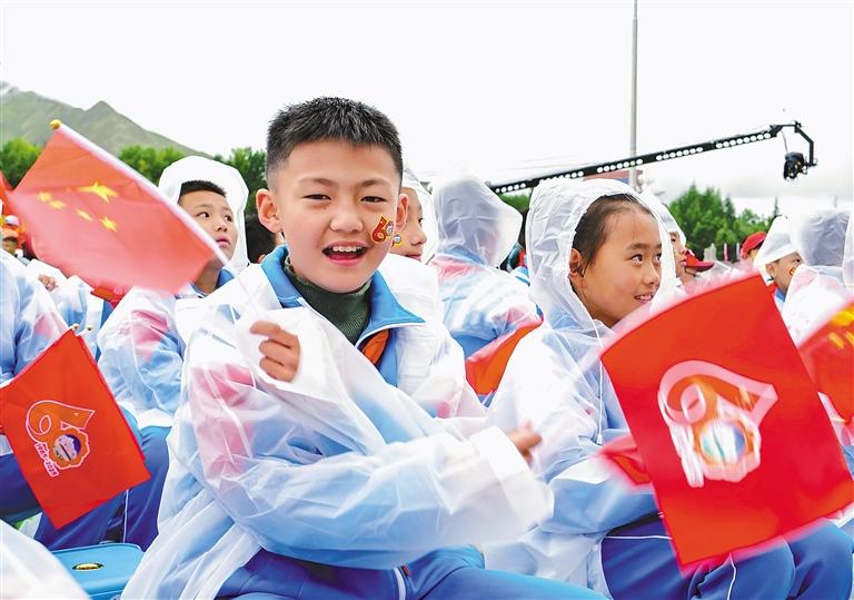 圖為西藏自治區(qū)成立60周年慶祝大會現(xiàn)場,臺下小朋友揮舞著國旗。記者 丹增群培 攝