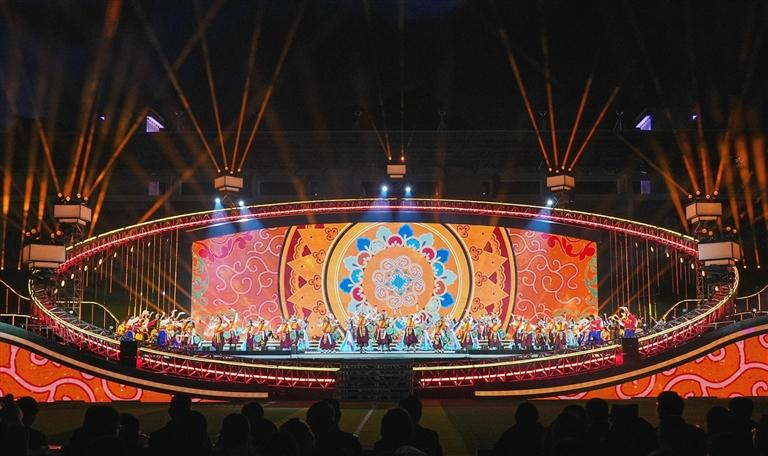 舞臺設(shè)計(jì)同樣暗藏巧思,主體采用巨型“同心圓”架構(gòu),設(shè)計(jì)中巧妙嵌入藏族傳統(tǒng)建筑的經(jīng)典紋樣,同時(shí)將山南的人文風(fēng)貌與山水景致融入其中,讓地域特色與藝術(shù)美學(xué)自然交融。