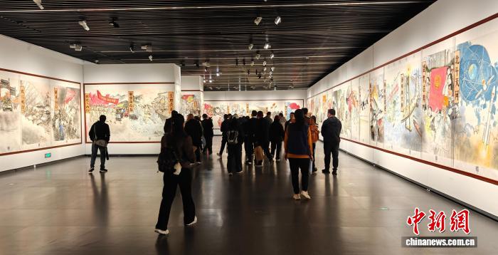 展覽分為兩個(gè)部分。第一部分是《信仰的紅色印記》百米長(zhǎng)卷,該長(zhǎng)卷67個(gè)畫面以中國(guó)傳統(tǒng)水墨畫形式,生動(dòng)描繪了中國(guó)共產(chǎn)黨波瀾壯闊的百年輝煌歷程。第二部分《墨??v筆》的48幅作品,從雄偉的高山到奔騰的江河,從廣袤的平原到寧?kù)o的湖泊,展現(xiàn)了祖國(guó)各地的壯麗山河。