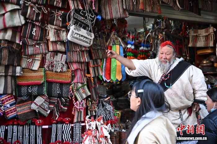 圖為藏式老物件店主次仁羅布給游客推薦藏式氆氌側(cè)掛包。中新社記者 貢嘎來(lái)松 攝