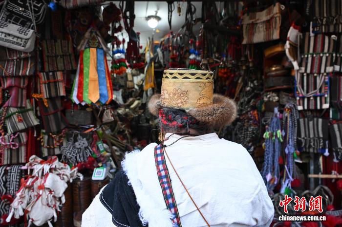 12月9日,西藏拉薩市八廓街沖賽康旁的背陰巷口,55歲店主次仁羅布的藏式老物件小店熱鬧非凡。不足30平方米的空間里,烏朵、馬包、藏式氆氌側(cè)掛包等好物琳瑯滿目,既有時(shí)光沉淀的老物件,也有手藝人新制精品。小店吸引本地民眾、年輕人及游客紛紛選購(gòu),生意紅火。圖為游客選購(gòu)藏式氆氌側(cè)掛包。中新社記者 貢嘎來(lái)松 攝