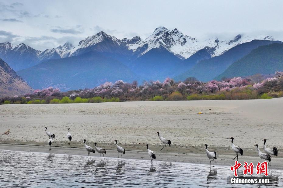 3月30日,在西藏林芝市巴宜區(qū)更章門巴民族鄉(xiāng),黑頸鶴與周邊的村莊、桃花、雪山融為一體,成為春日里的一道靚麗的風景線。