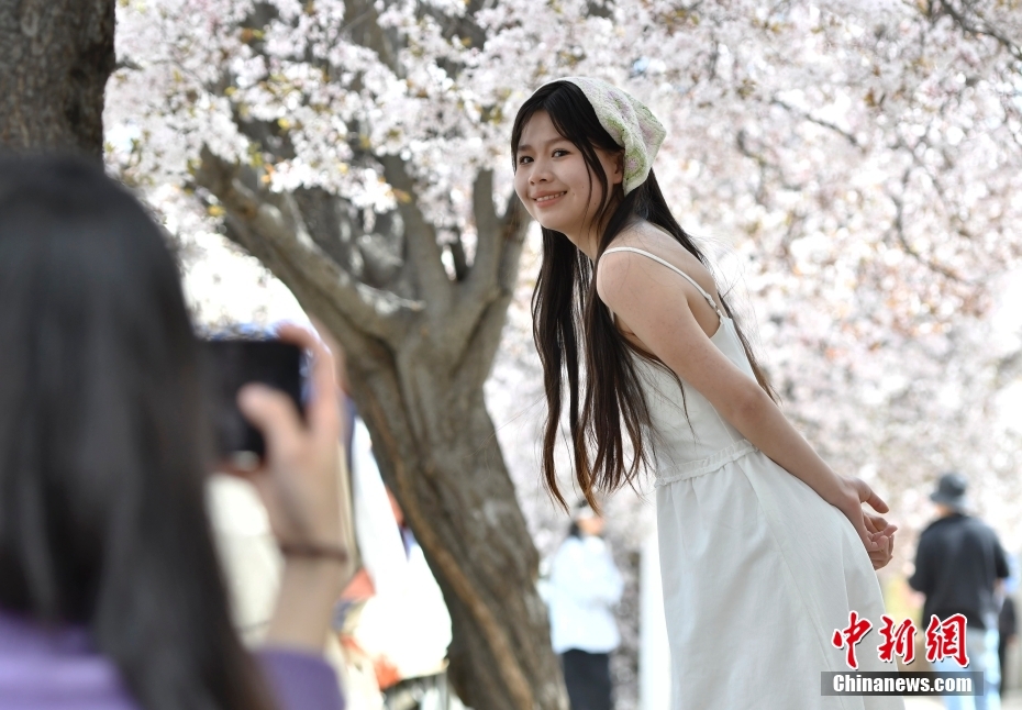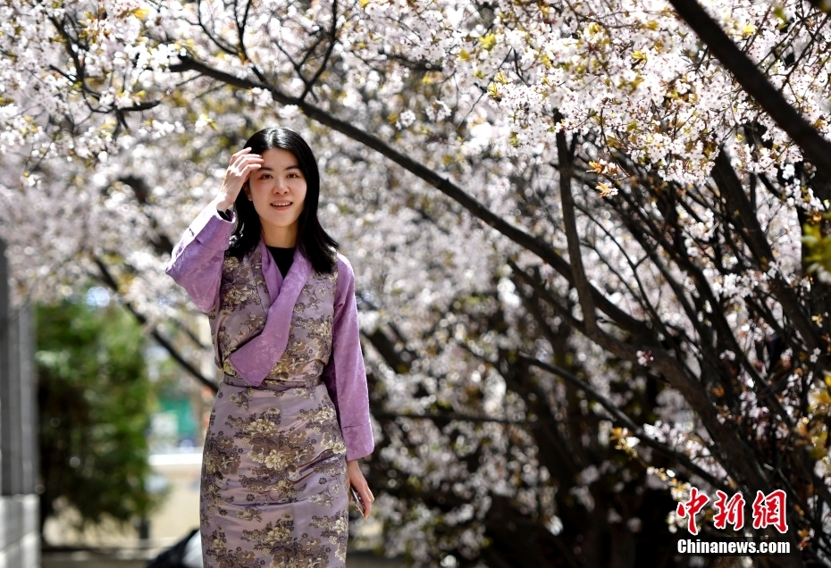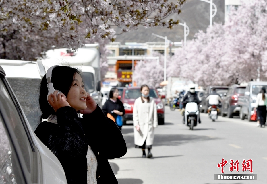 4月1日,市民在春花綻放的道路旁賞花。隨著雪域高原天氣回暖,西藏拉薩市區(qū)各條道路春花綻放。因道路兩側(cè)繁華似錦,拉薩市城關(guān)區(qū)軍民路成網(wǎng)紅打卡地,市民游客紛紛前來打卡拍照。