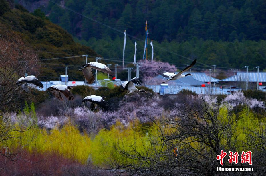 西藏林芝:黑頸鶴與桃花共繪春日畫卷