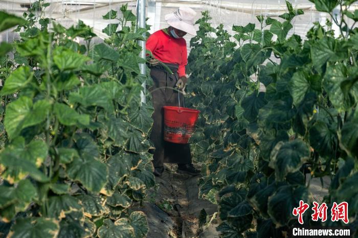 圖為農(nóng)牧民采摘黃瓜?!〗w波 攝