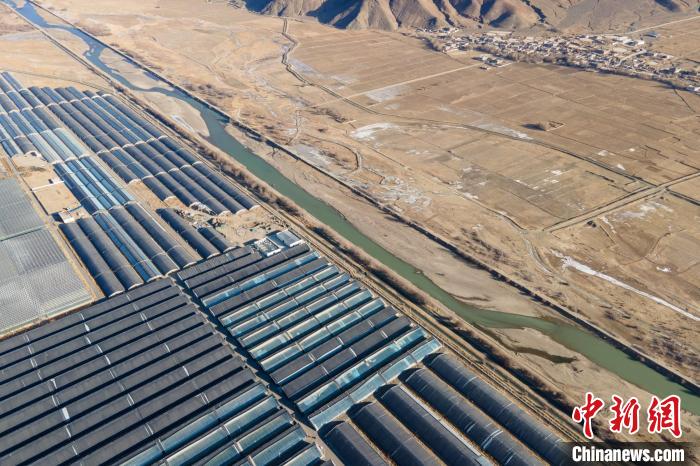 圖為1月28日上午,航拍西藏日喀則珠峰現(xiàn)代農(nóng)業(yè)科技創(chuàng)新博覽園蔬菜大棚?!〗w波 攝
