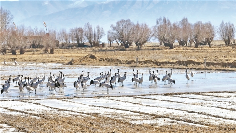 天氣漸寒,在雅江之畔的日喀則市南木林縣艾瑪鄉(xiāng),越來越多的黑頸鶴陸續(xù)抵達(dá)棲息地。