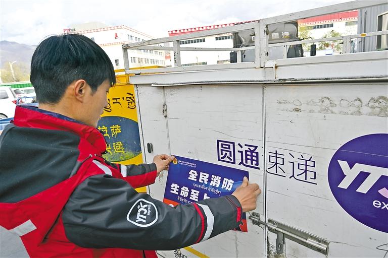 志愿者在快遞車(chē)上張貼消防宣傳海報(bào)。 郎永庫(kù) 李鑫舞 攝