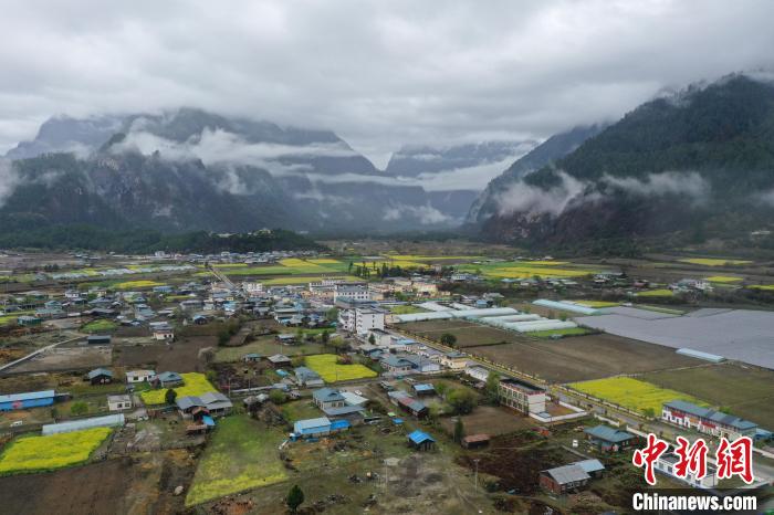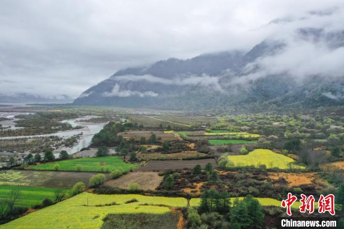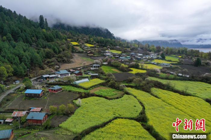 4月4日,西藏林芝市波密縣易貢鄉(xiāng)在雨后迎來(lái)絕美景致。云霧繚繞在群山之間,金黃的油菜花與森林、易貢湖、藏式民居、碧綠的青稞田相互映襯,宛如仙境。(無(wú)人機(jī)照片)中新社記者 貢嘎來(lái)松 攝