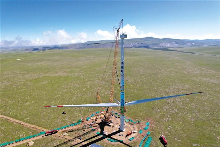 圖為西藏開投色尼區(qū)曲果嘎姆200MW風電項目首臺風電機組吊裝現(xiàn)場。周俊 記者 李梅英 攝