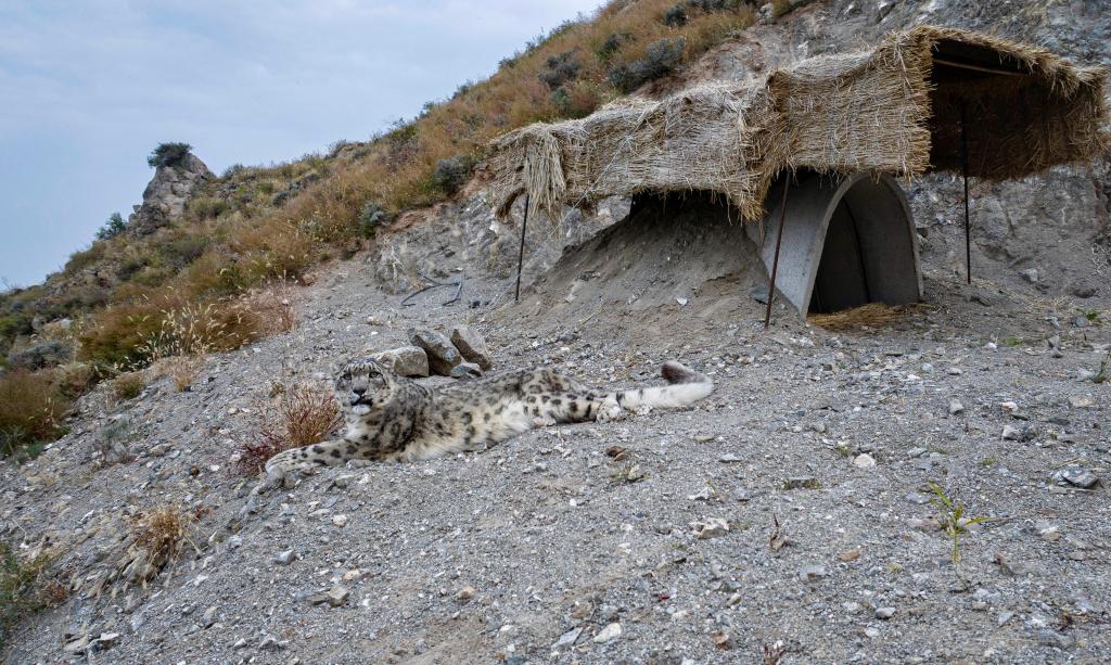 在保護區(qū)內(nèi)的雪豹保護研究基地,一座依山而建的訓練場中,有兩只雪豹正在進行適應性訓練。圍欄沿山勢起伏而建,山上專門開挖了巖石洞穴。上午時分,監(jiān)控畫面顯示這兩只雪豹正在洞中休憩。