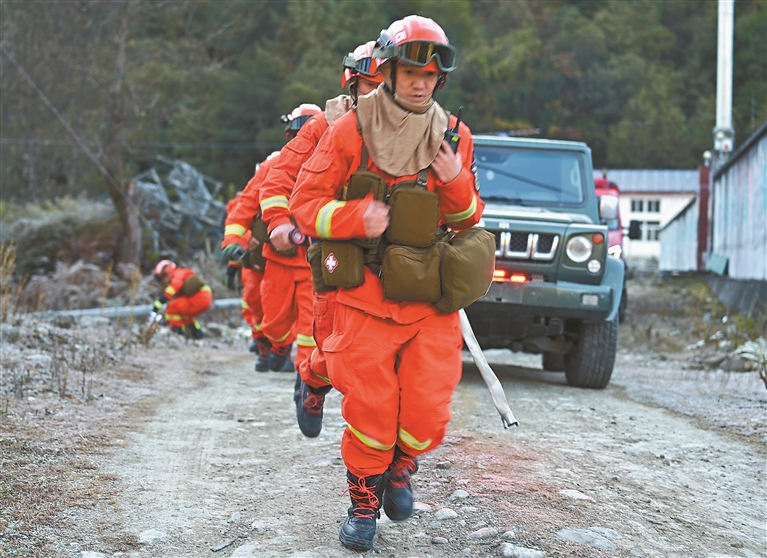 波密縣森林消防中隊(duì)駐墨脫分隊(duì)在開(kāi)展消防演練滅火工作。