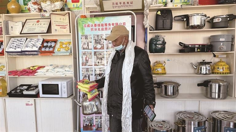 當(dāng)時(shí),該超市還有其他群眾在兌換物品?!袄旁谶@里變成了值錢的東西,真正實(shí)現(xiàn)了變廢為寶!”德慶鎮(zhèn)村民旺姆捧著手機(jī),滿臉笑意地向記者展示積分頁面里面她的5386積分,她正盤算著兌換5套規(guī)格不同的鋁鍋和一套甜茶餐具?!爸坝梅e分換過大米、洗衣液、洗潔精、油等物品,這次想換些實(shí)用的大件。”旺姆說,最讓她滿意的是兌換的奶粉,“省下了制作甜茶時(shí),買奶粉的錢,這積分兌換真是辦到了我們心坎里?!?/p>
