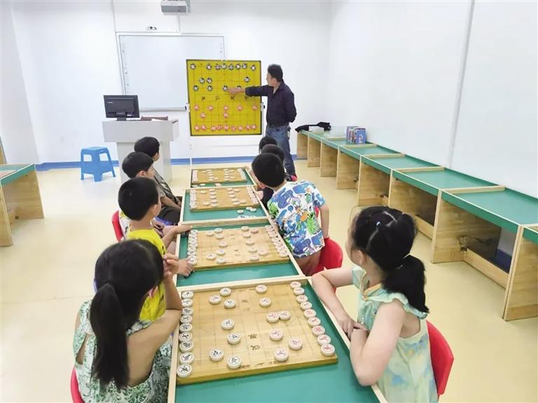 象棋興趣班上學(xué)生認(rèn)真聽老師講課。