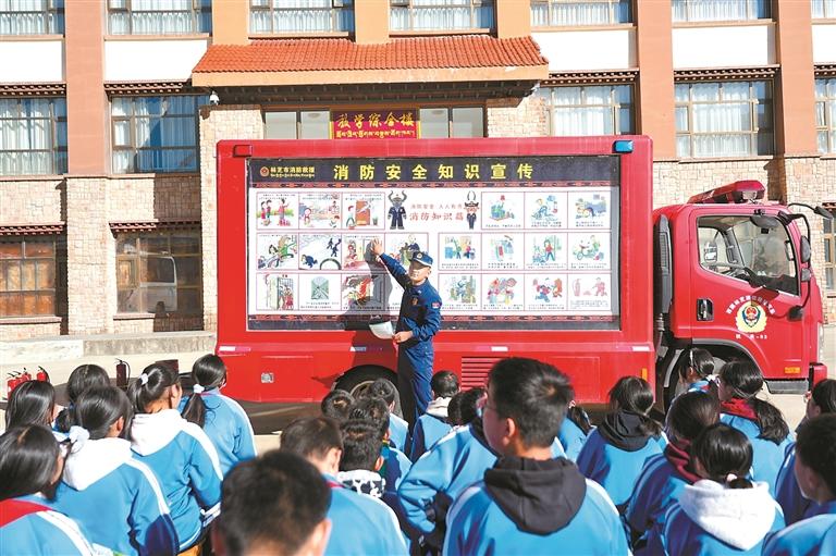 消防宣傳員依托流動消防宣傳車為學(xué)生講解消防安全知識。肖暄 攝