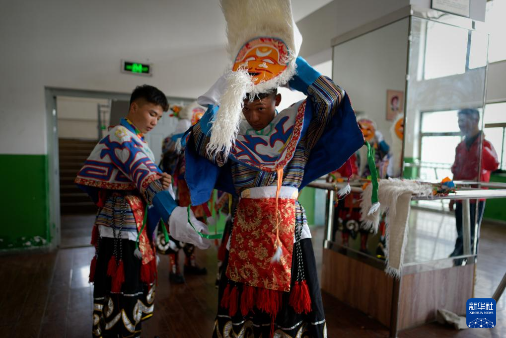 9月9日,在拉薩市第二中等職業(yè)技術學校,學生穿戴藏戲表演服飾。新華社記者 晉美多吉 攝