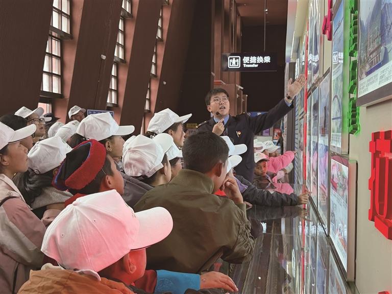 “這條全長435.48公里的鐵路,橋隧比高達(dá)75%,結(jié)束了藏東南地區(qū)不通鐵路的歷史!”隨著工作人員的講解,同學(xué)們的目光追隨著沙盤上的鐵軌延伸,理解了這條鐵路修建的困難程度,更讀懂了這條鐵路對“加強(qiáng)聯(lián)系交流、維護(hù)民族團(tuán)結(jié)”的重要意義。