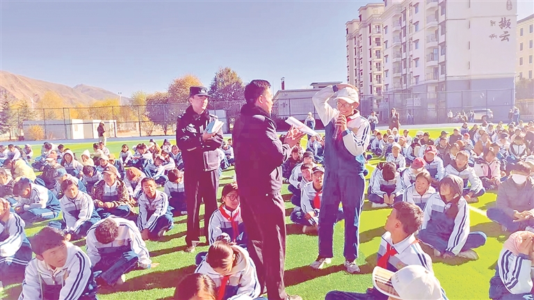 圖為民警在拉薩市第一中學(xué)開展普法宣傳。