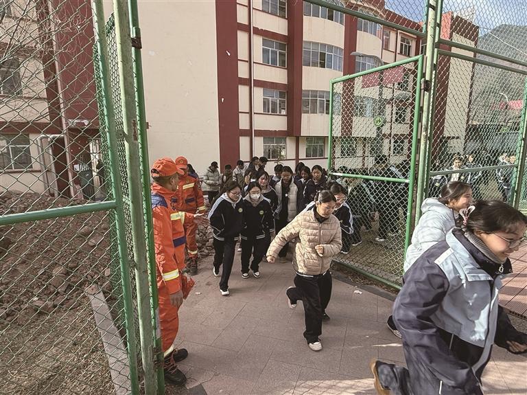 指戰(zhàn)員現(xiàn)場(chǎng)組織開展地震應(yīng)急疏散演練。圖由卡若區(qū)消防救援機(jī)動(dòng)大隊(duì)提供