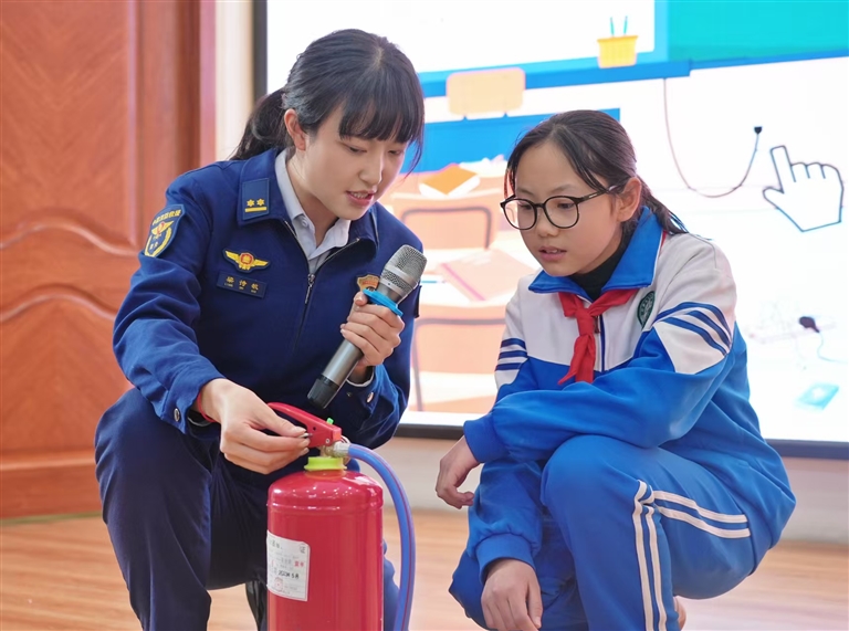 學(xué)校師生在消防員指導(dǎo)下體驗滅火器撲滅初起火災(zāi)。肖暄 攝