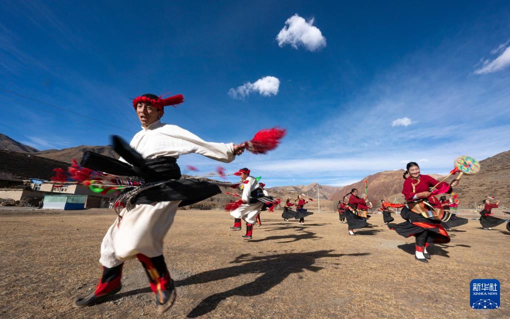 西藏昌都市丁青縣尺犢鎮(zhèn)烏巴村文藝演出隊(duì)在跳熱巴舞(1月5日攝)。新華社記者 丁增尼達(dá) 攝 ??