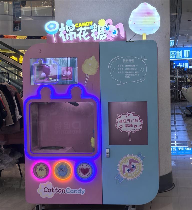 除了自助游戲機,自助棉花糖機也是一大亮點。在拉薩市多家大型商超內,自助棉花糖機成為了孩子們的新寵。記者走訪發(fā)現(xiàn),目前拉薩各大商場內的棉花糖機大多為同一品牌,機子中的棉花糖有42種,一個棉花糖售價19.9元。市民可以根據(jù)口味、顏色、造型選擇棉花糖,操作流程也十分便捷,選購后掃碼支付即可。
