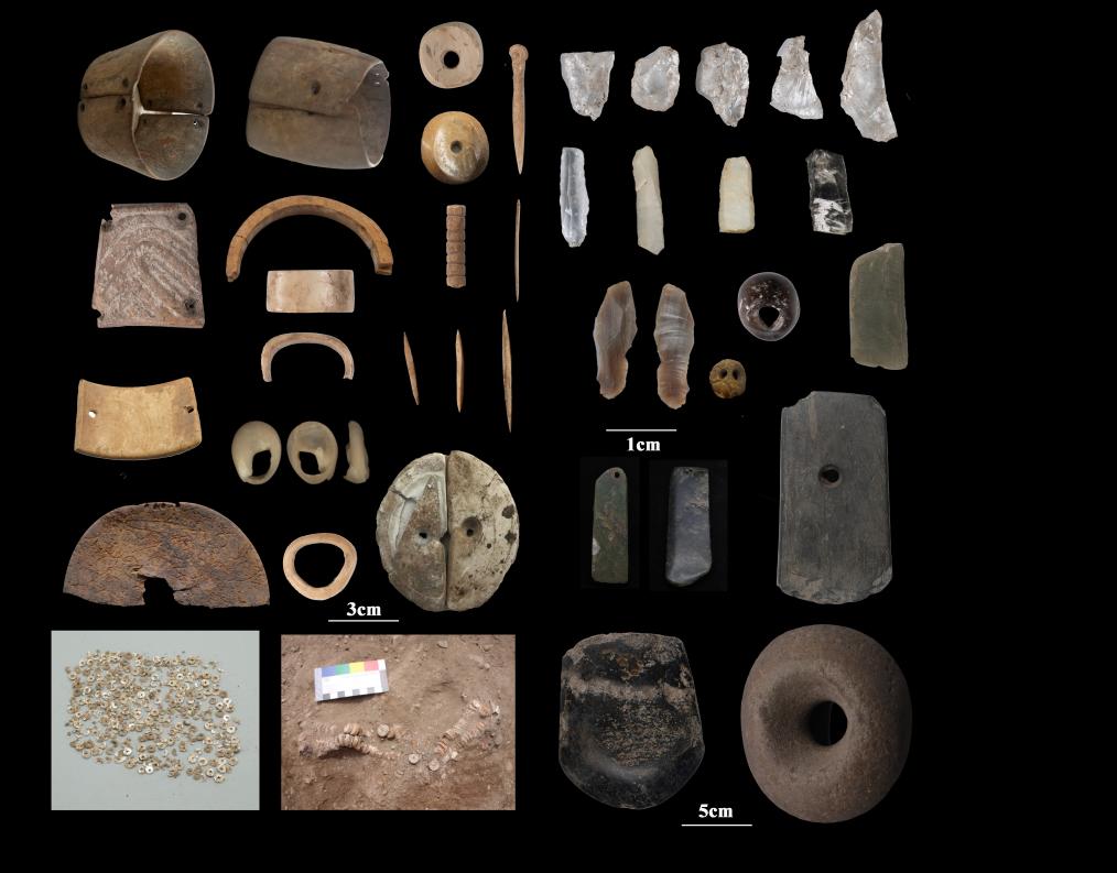 瑪不錯(cuò)遺址第一期出土遺存典型骨器、石器、蚌器、滑石珠等。(圖片由西藏自治區(qū)文物保護(hù)研究所提供)