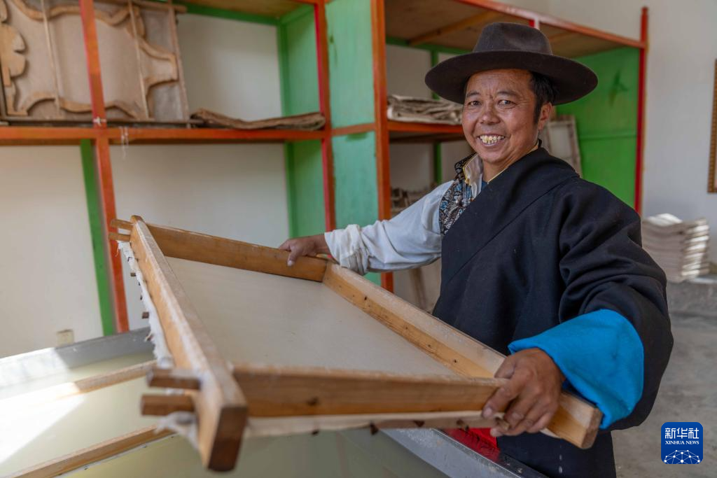 8月12日,雪拉藏紙制作技藝自治區(qū)級代表性傳承人格桑旦增在制作藏紙。新華社記者 旦增尼瑪曲珠 攝 ??