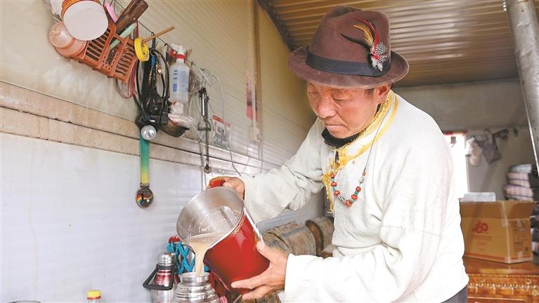 圖為日喀則市定結(jié)縣郭加鄉(xiāng)切村村民拉巴在用中央代表團送來的酥油茶壺打酥油茶。本報通訊員 扎西卓嘎 攝