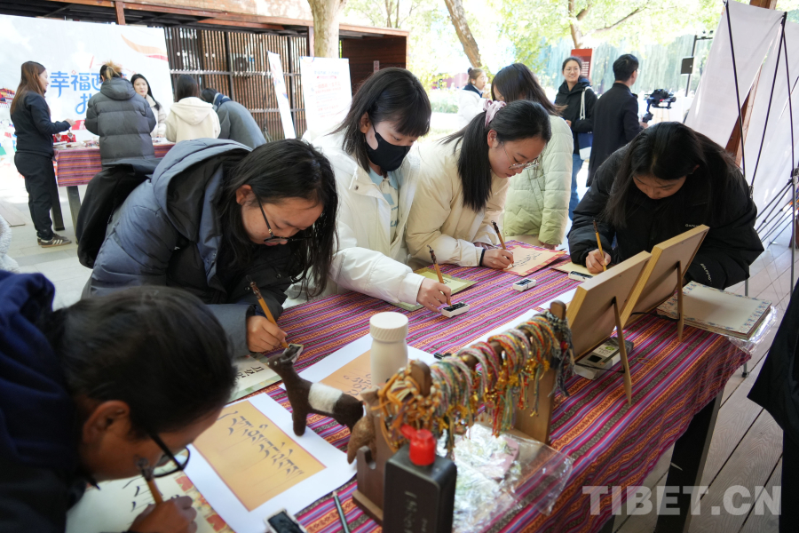圖為卓嘎在活動(dòng)現(xiàn)場(chǎng)書(shū)寫(xiě)祝福語(yǔ)“扎西德勒” 攝影:趙佳
