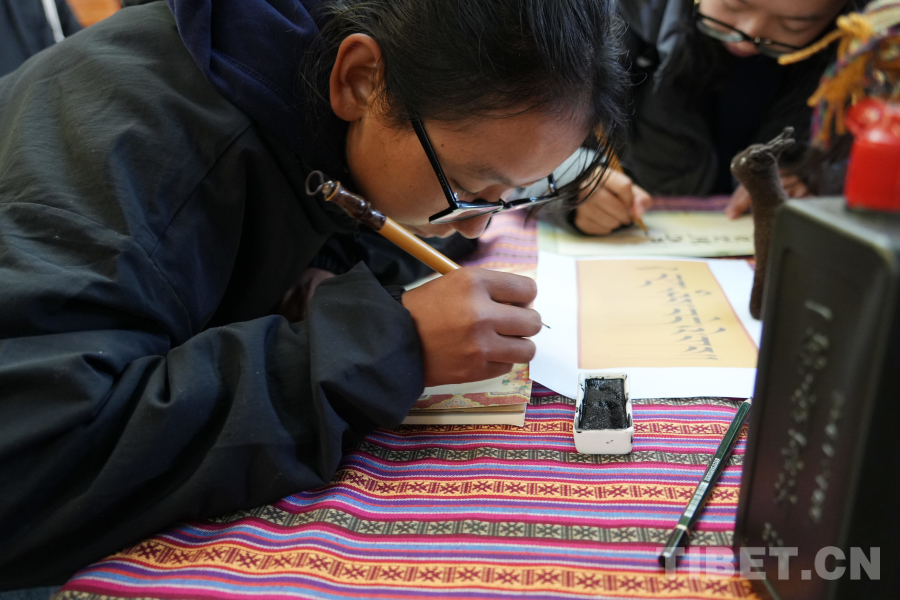 圖為同學(xué)們手拿傳統(tǒng)竹筆跟藏族老師學(xué)寫(xiě)藏文 攝影:趙佳